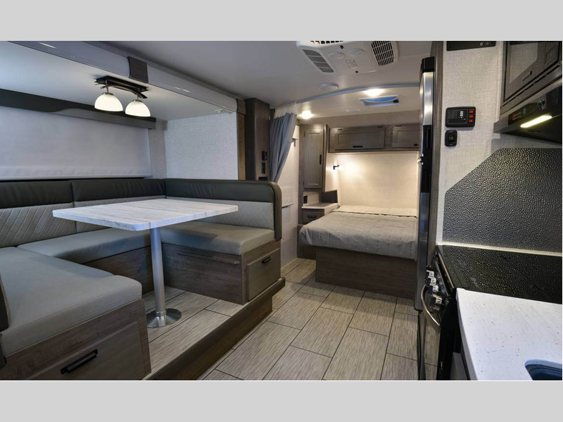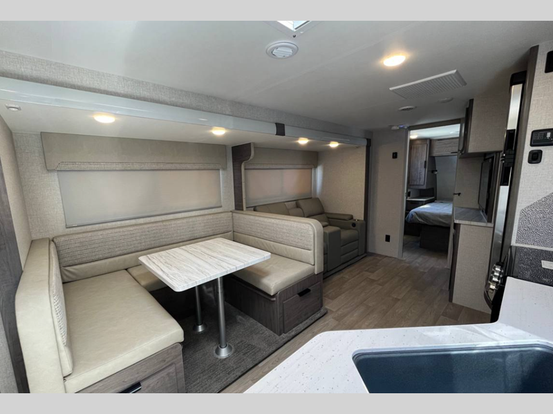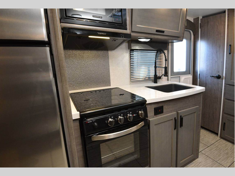 The durable construction that consists of dual Azdel walls, a one-piece roof, and block foam insulation means you can enjoy camping for years to come. There are Keyed-Alike entry and storage compartment doors outside, along with an exterior wash station, and an aerodynamic nose profile for an easier tow. Comfortable seating and sleeping space inside will have you feeling right at home, and there is plenty of storage spaces for your belongings.