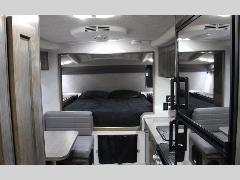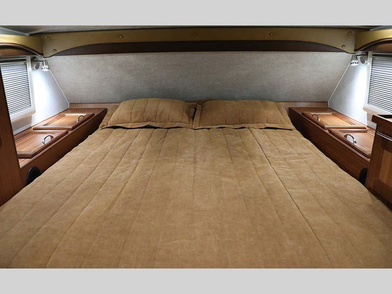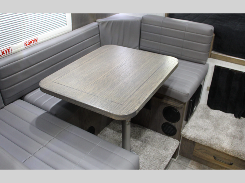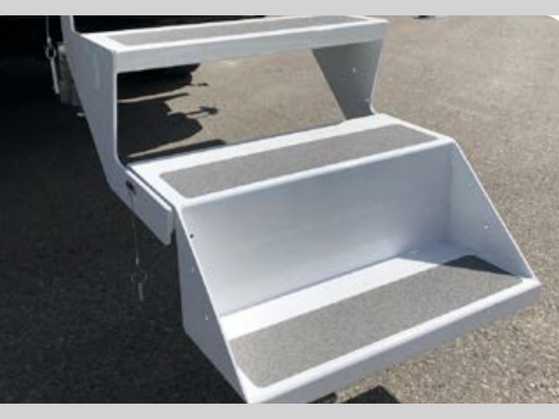 The interiors are designed with premium leatherette seating, solid Sapele hardwood, and acrylic thermal windows. Crank up the tunes with outside speakers, easily enter/exit with the removable third step, and stay protected by the power side awning. The wireless backup camera helps you safely arrive and leave your destinations with no bumps or dings!