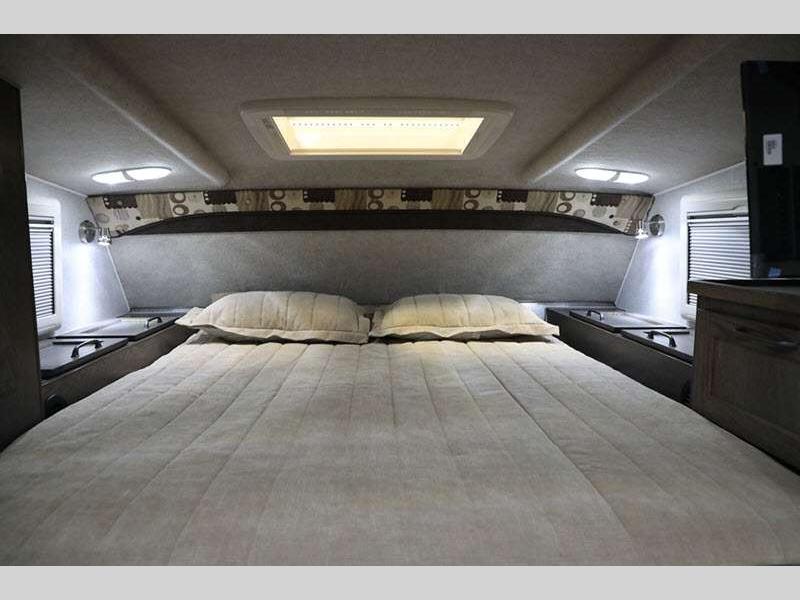 Sleeps 3 Length 18 ft 2 in Ext Width 8 ft 2 in Ext Height 8 ft 10 in Int Height 6 ft 8 in Dry Weight 3435 lbs Fresh Water Capacity 36 gals Grey Water Capacity 40 gals Black Water Capacity 18 gals Furnace BTU 20000 btu Available Beds Queen Refrigerator Type Two Way Refrigerator Size 6.3 cu ft Cooktop Burners 3 Number of Awnings 2 Floor Length 10 ft 11 in Center of Gravity Front 48 in LP Tank Capacity 40 lbs Water Heater Capacity 6 gal Water Heater Type DSI AC BTU 10000 btu Truck Bed Size Long TV Info LR LCD TV Screen 12V Awning Info 10' Side, 7' Power Rear Body Style Hard-Side Shower Type Wet/Bath Shower -
