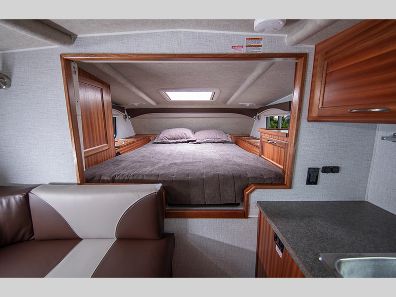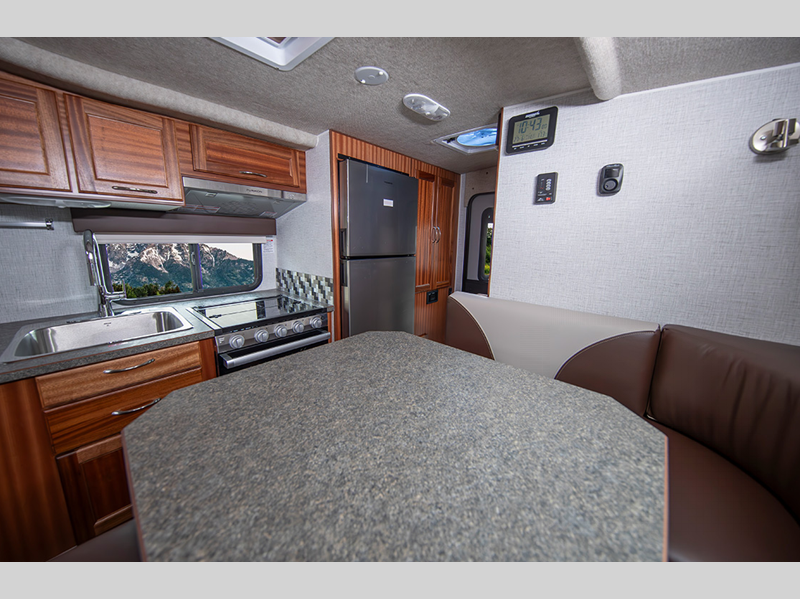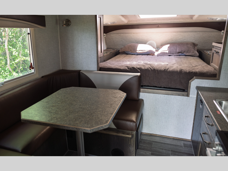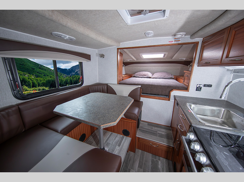The Northern Lite Sportsman Plus truck camper has some upgrades and additions you'll want to check out! The first thing you'll notice when you walk in your Sportsman Plus is the upgraded dinette that has an increased seating size, so you'll have more space to sit around and chat with friends, and you'll also have more space when you turn the dinette into a bed.