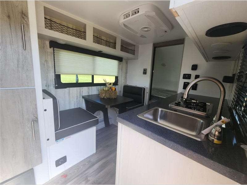 Sleeps 2 Slides 1 Length 17 ft 6 in Ext Width 7 ft 11 in Ext Height 8 ft 1 in Hitch Weight 288 lbs GVWR 2500 lbs Dry Weight 2202 lbs Cargo Capacity 1298 lbs Fresh Water Capacity 10 gals Grey Water Capacity 30 gals Black Water Capacity 15 gals Tire Size 13" Furnace BTU 18000 btu Refrigerator Type 12 Volt Refrigerator Size 3.3 cu ft Cooktop Burners 2 Shower Size 24" x 36" Axle Weight 3500 lbs LP Tank Capacity 20 lbs Water Heater Type On Demand Tankless AC BTU 15000 btu Axle Count 1 Number of LP Tanks 1 Shower Type Standard Electrical Service 30 amp Similar Floorplans